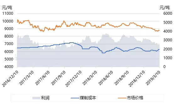 由上圖可見,進入2019年,煤制聚乙烯的生產(chǎn)利潤逐漸減少。而增值稅的降低,對西北生產(chǎn)企業(yè)來說,意味著運輸成本或有所降低,如當前運送到山東地區(qū)銷售大約需要300元/噸的運輸成本,降稅后或?qū)p少3元/噸,這就進一步增加了煤化工生產(chǎn)企業(yè)的利潤空間。