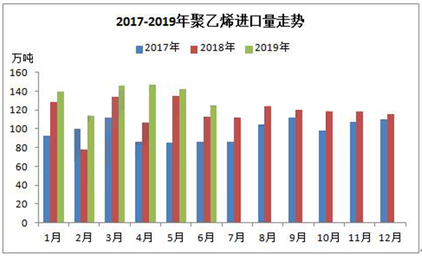據(jù)統(tǒng)計,2019年上半年國內(nèi)PE產(chǎn)量在867.21萬噸,較2018年同期(802.68萬噸)增加64.53萬噸,增幅在8.04%。2019年上半年國內(nèi)PE石化大修裝置較少,開工率較高在92%-98%之間波動。除此之外,內(nèi)蒙古久泰能源28萬噸/年全密度裝置在5月份順利投產(chǎn),6月份產(chǎn)量釋放產(chǎn)品逐步供應(yīng)市場。