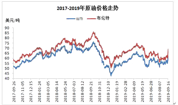 9月14日,沙特關(guān)鍵原油設(shè)施遭受無人機(jī)攻擊,導(dǎo)致其關(guān)閉一半原油產(chǎn)量,影響全球約5%的日均產(chǎn)量。9月16日,原油受此提振大幅上漲,美布兩油均創(chuàng)下近十年內(nèi)最大漲幅,紐約商品期貨交易所WTI 10月原油期貨合約收盤上漲8.05美元,至62.90美元/桶,漲幅14.68%,洲際交易所布倫特11月原油期貨合約收盤上漲8.80美元,至69.02美元/桶,漲幅14.61%。