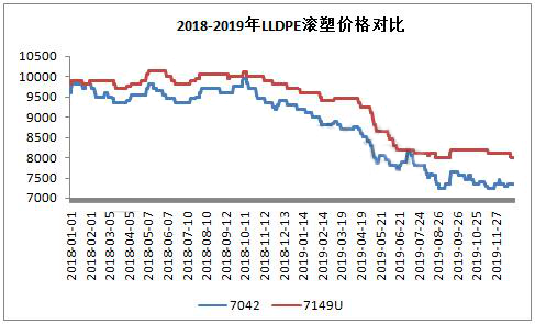 從圖中顯示,2018-2019年國內(nèi)滾塑料價格明顯高于普通線性,且價格差距逐步擴(kuò)大,2019年較普通線性高50-850元/噸。目前國內(nèi)聚烯烴行業(yè)產(chǎn)能過剩,國內(nèi)石化一直致力于高端產(chǎn)品研發(fā),搶占高端領(lǐng)域,以獲取較大利潤。從線性區(qū)域來看,由于產(chǎn)能過剩,7042價格近兩年一直處于下行通道,削減了石化利潤。線性行業(yè),近年來,研發(fā)主要方向集中在C8線性,茂金屬、滾塑料等,其中滾塑料做為一個分支,近年研發(fā)較多。