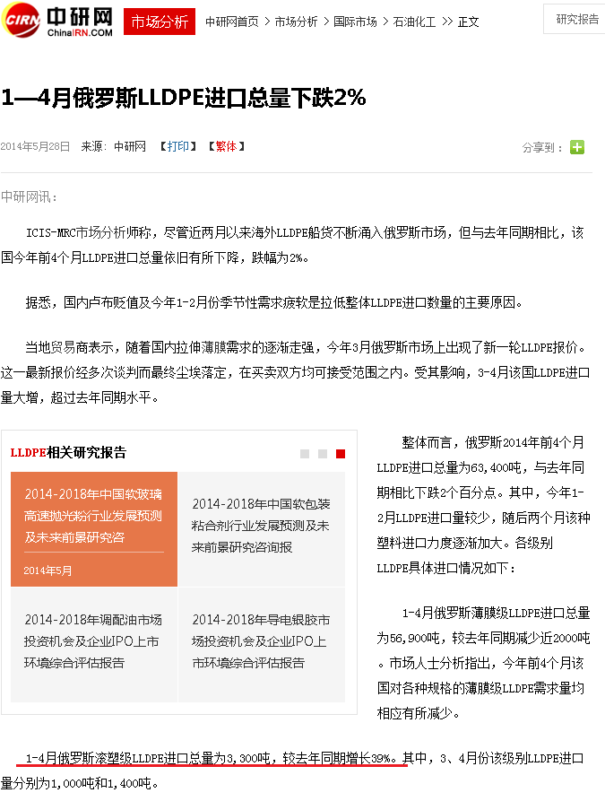 【2014-5-28】1-4月份俄羅斯?jié)L塑料進(jìn)口量增加39%